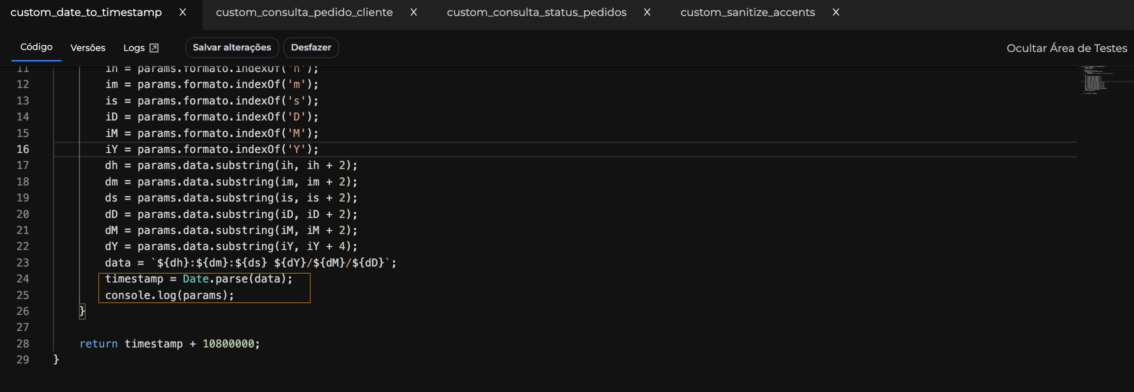 Para inserir logs nas functions e consultá-los posteriormente, basta configurar um *console.log()* na sua function. Por exemplo: