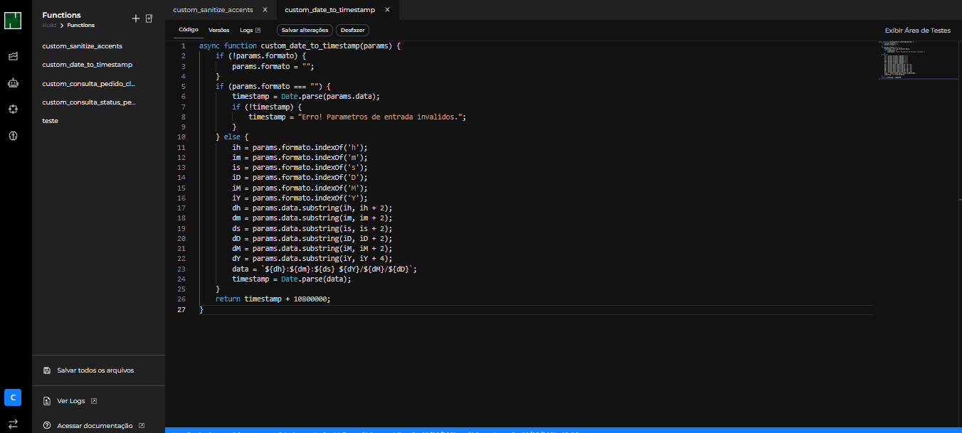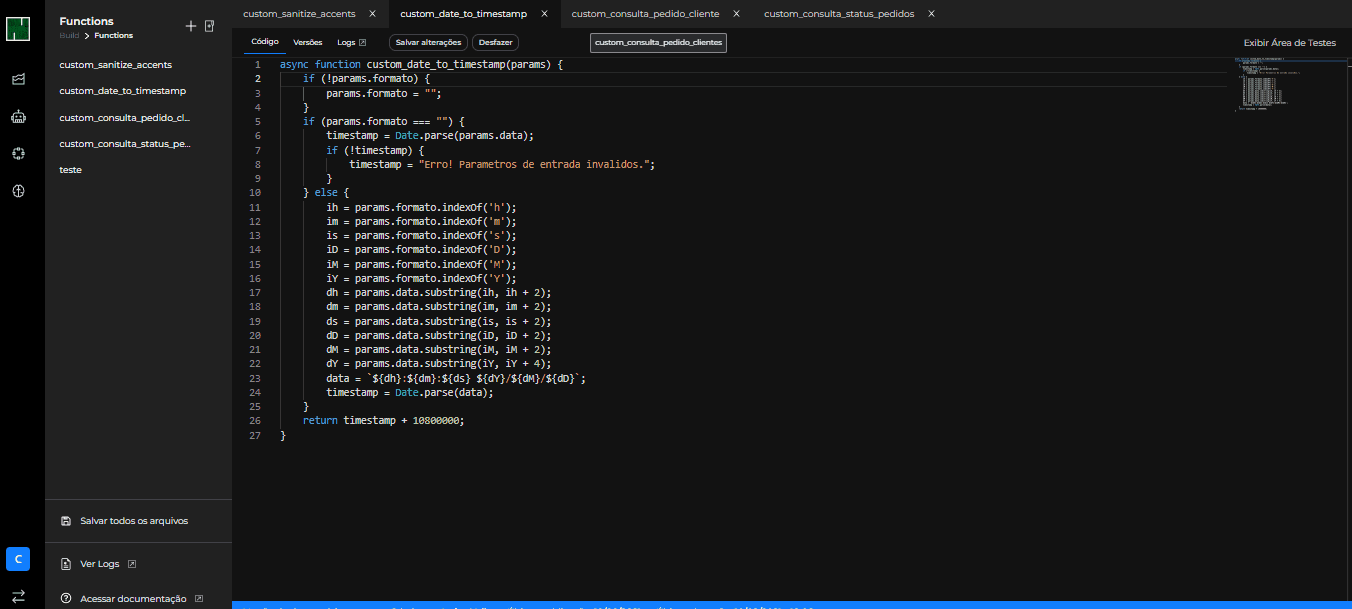 Se você clicar em mais de uma Functions na edição, elas ficarão separadas **por abas,** como mostra a imagem abaixo: