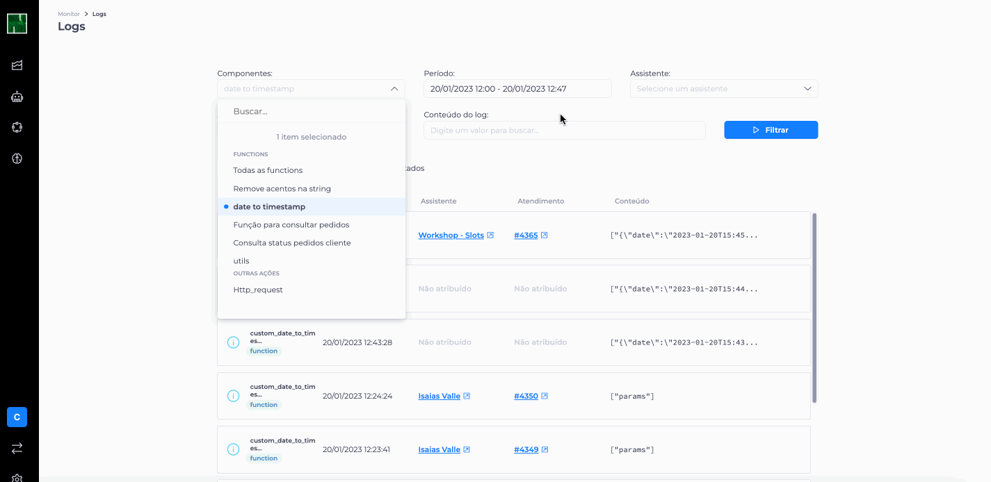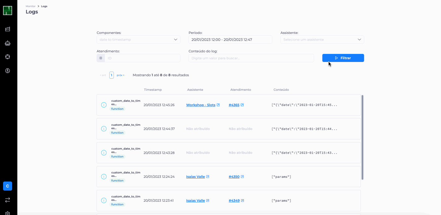 <figure><img src="https://776911411-files.gitbook.io/~/files/v0/b/gitbook-x-prod.appspot.com/o/spaces%2F-MBjaNm5lB1Yqgih1JCA%2Fuploads%2FUT30GSh912Z57Sh7mV8x%2FlogsAssistente.gif?alt=media&#x26;token=22aafa22-97ed-44f5-a941-e9740e4ad167" alt=""><figcaption></figcaption></figure>