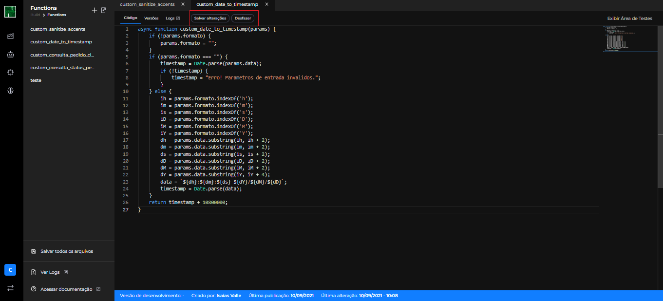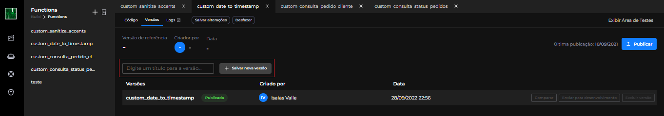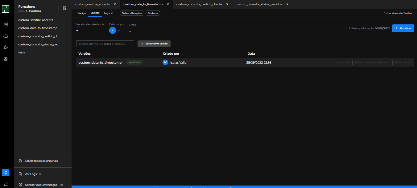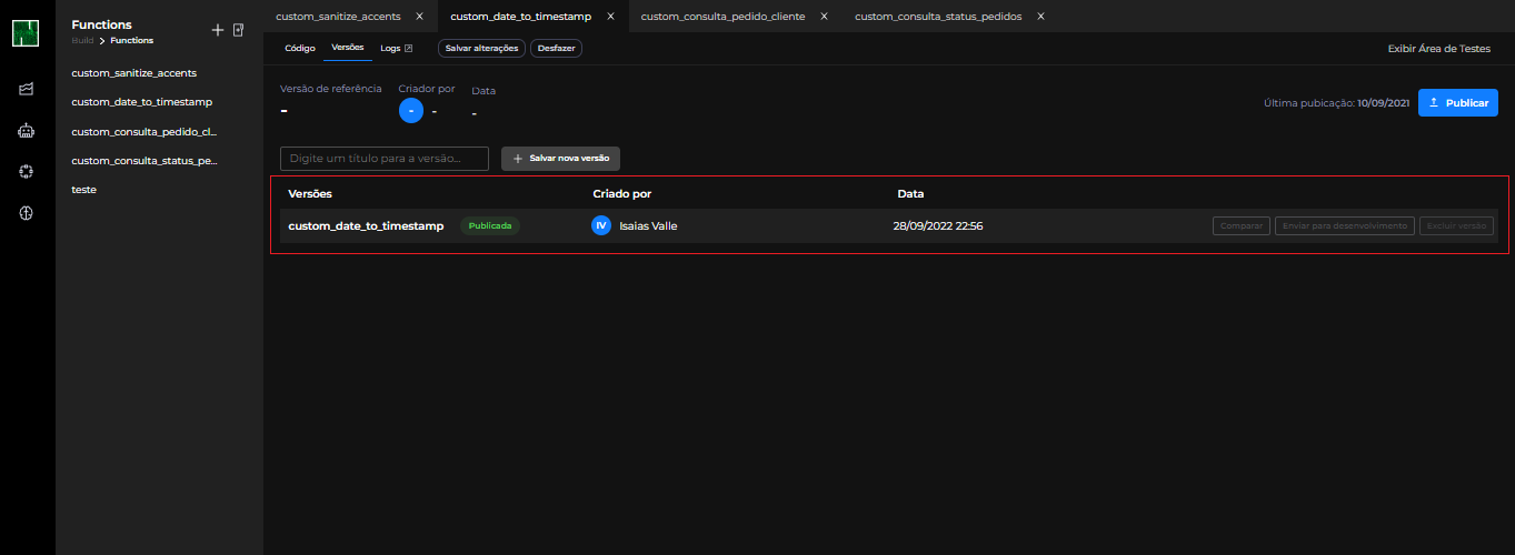 * **Enviar para desenvolvimento:** ao clicar nessa opção, a versão selecionada da Functions será enviada para a tela de edição, ou seja, para aba de código. Assim, é possível que você crie uma nova versão editada da que acabou de restaurar. Essa funcionalidade é como um backup de versões, por onde poderá recuperá-lo e editá-lo.