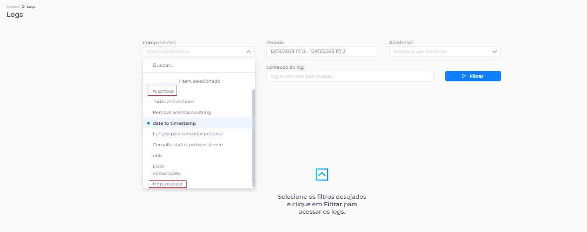2. **Functions:** filtre por uma ou todas as Functions criadas. Mas atenção: é preciso configurar um console.log na Function para gerar logs.