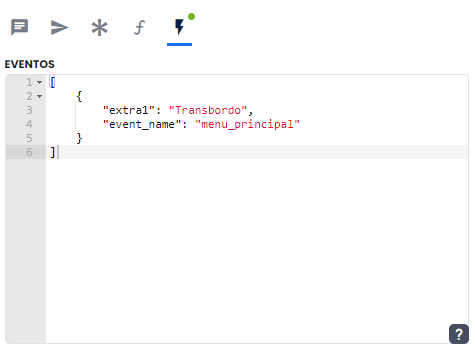 Identificador*: é o nome da variável usada no nó; Label*: breve relato do que traz esse evento; Campos extra1 e extra2: use para adicionar mais informações aos eventos. Esses campos podem ser usados como valores para relatórios. Opcional.